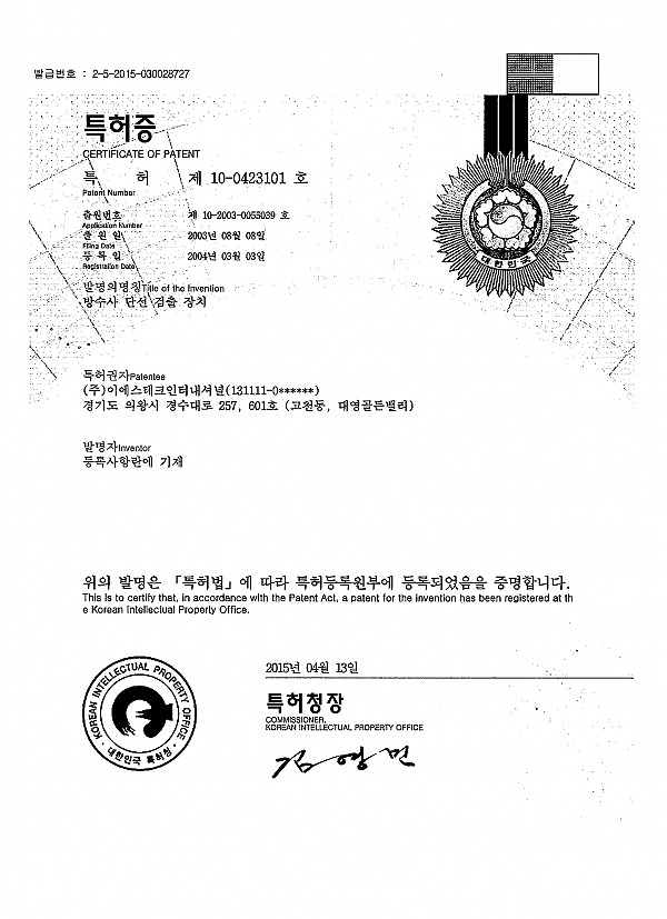 Patent - Detector for Disconnection of Waterproof thread > Certificate